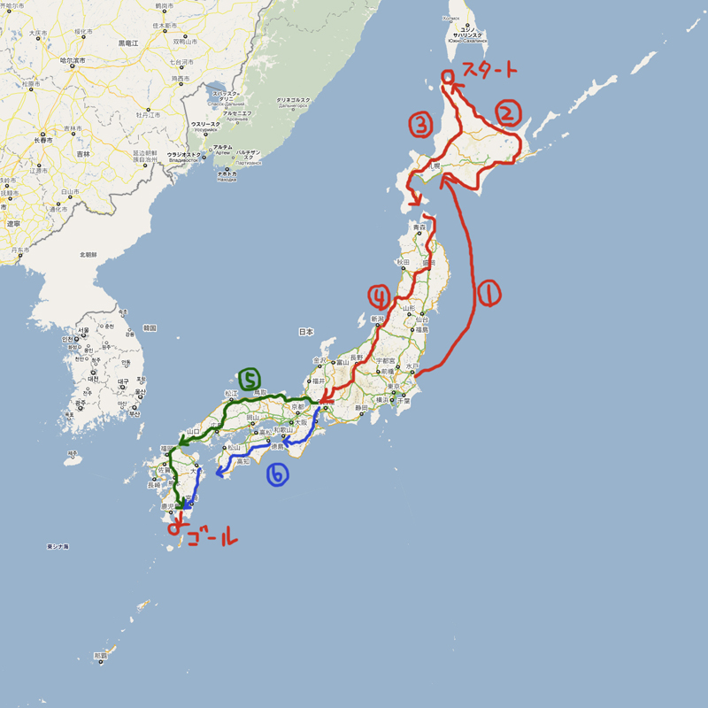 そこまで行ってやっとスタートとし、ゴールは鹿児島県佐多岬まで